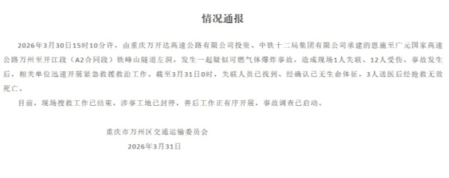 国普网重庆讯:据重庆市万州区人民政府网站消息,3月31日,重庆市万州区交通运输委员会发布情况通报,2026年3月30日15时10分许,由重庆万开达高速公路有限公司投资、中铁十二局集团有限公司承建的恩施至广元国家高速公路万州至开江段(A2合同段)铁峰山隧道左洞,发生一起疑…