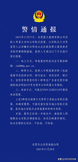 广东东莞市公安局南城分局11月28日发布警情通报。通报称,11月27日,东莞盟大集团有限公司(下称“盟大集团”)实控人李某主动向公安机关投案。公安机关已对李某等人以涉嫌非法吸收公众存款犯罪立案侦查并采取刑事强制措施。目前,案件正在进一步侦办中。请投资人积极配合…