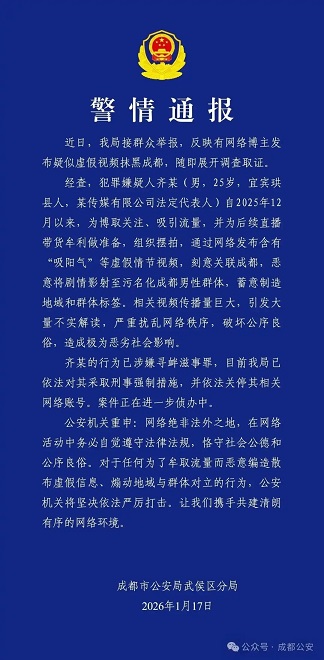 国普网四川讯:1月17日,微信公众号“成都公安”发布通报:近日,我局接群众举报,反映有网络博主发布疑似虚假视频抹黑成都,随即展开调查取证。经查,犯罪嫌疑人齐某(男,25岁,宜宾珙县人,某传媒有限公司法定代表人)自2025年12月以来,为博取关注、吸引流量,并为后续…