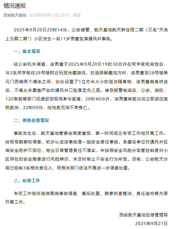 山西西安航天基地应急管理局9月21日晚发布通报:2025年9月20日20时14分,公安接警,航天基地航天新佳园二期(又名“天浩上元郡二期”)小区发生一名11岁男童坠落通风井事故。一、基本情况经公安机关调查,该男童于2025年9月20日19时30分许在同学家吃完饭后,与3名同学前往28号楼…
