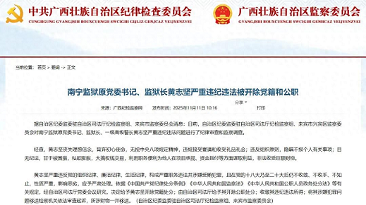 国普网广西讯:据自治区纪委监委驻自治区司法厅纪检监察组、来宾市监察委员会消息:日前,自治区纪委监委驻自治区司法厅纪检监察组、来宾市兴宾区监察委员会对南宁监狱原党委书记、监狱长、一级高级警长黄志坚严重违纪违法问题进行了纪律审查和监察调查。经查,黄志坚丧失…
