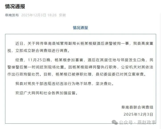 国普网安徽讯:据安徽阜阳阜南县联合调查组12月3日发布情况通报,近日,关于网传阜南县城管局副局长杨某根疑酒后袭警被拘一事,我县高度重视,立即成立联合调查组进行调查。经查,11月25日晚,杨某根参加喜宴,酒后在其居住地与邻居发生口角,民警接警后第一时间赶到现场…
