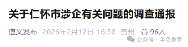 国普网贵州讯:据贵州遵义市联合调查组2月12日发布仁怀市涉企有关问题的调查通报,通报如下: 2025年9月,有关媒体报道重庆泰克公司在仁怀投资有关情况引发社会关注。遵义市委、市政府高度重视,成立联合调查组,全面开展了调查工作。2017年8月14日,仁怀市政府授权有关职…