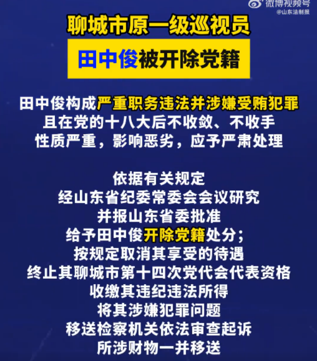 国普网山东讯:据山东省纪委监委消息,经山东省委批准,山东省纪委监委对聊城市原一级巡视员田中俊严重违纪违法问题进行了立案审查调查。田中俊,男,汉族,1962年12月出生,山东聊城高唐人。大学文化程度,学士学位,1986年9月加入中国共产党,1983年7月参加工作。曾任山…