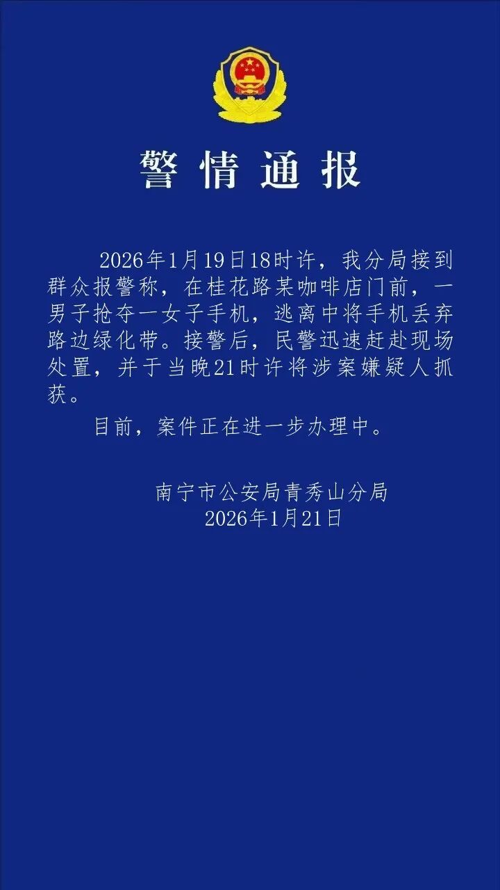 国普网讯:据青秀山警方微信公众号消息,1月21日,南宁市公安局青秀山分局发布警情通报。1月19日18时许,南宁市公安局青秀山分局接到群众报警称,在桂花路某咖啡店门前,一男子抢夺一女子手机,逃离中将手机丢弃路边绿化带。接警后,民警迅速赶赴现场处置,并于当晚21时许将涉案嫌疑人抓获。目前,案件正在进一步办理中。
