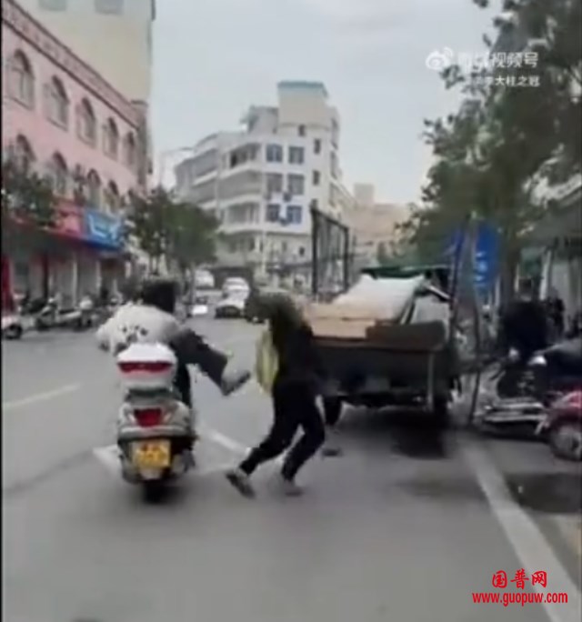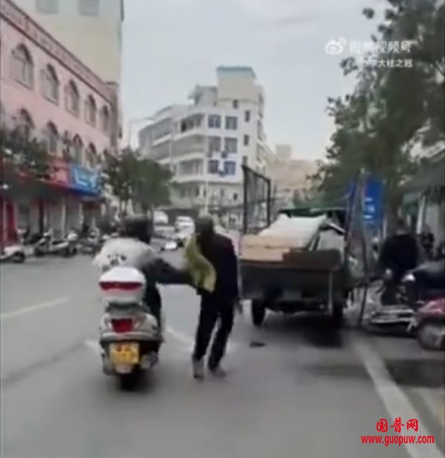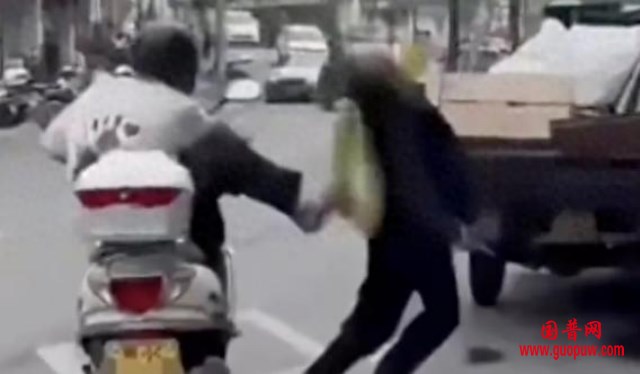 国普网广东讯:2月12日,广东茂名高州市石鼓镇一银行门口,一男子骑着摩托车,一脚将拾荒老人踹倒。