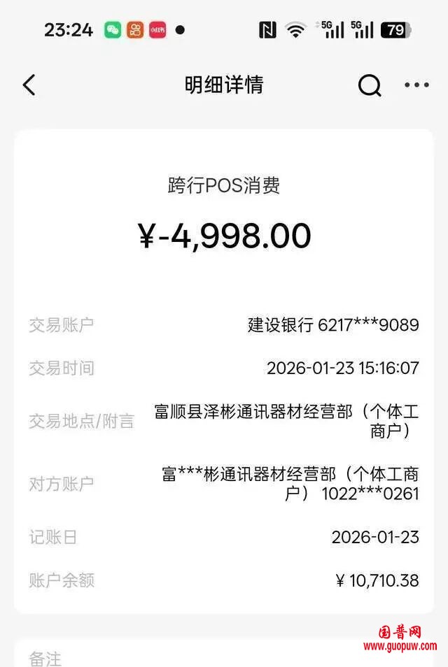 记者从刘先生提供的银行流水看到,这些钱在1月23日至25日三天内被分笔转走:第一笔是1月23日,通过POS机被刷走4998元;第二笔和第三笔分别于1月24日、25日,又被分别被转走5000元。