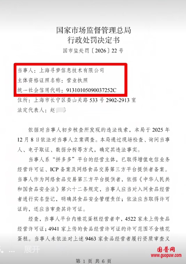 国普网讯:据国家市场监督管理总局国市监处罚〔2026〕22号行政处罚决定书记载:
