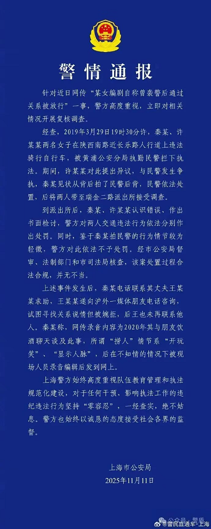 11月11日,上海市公安局发布警情通报:针对近日网传“某女编剧自称曾袭警后通过关系被放行”一事,警方高度重视,立即对相关情况开展复核调查。经查,2019年3月29日19时30分许,秦某、许某某两名女子在陕西南路近长乐路人行道上违法骑行自行车,被黄浦公安分局执勤民警拦…
