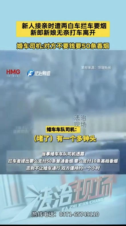近日,河北廊坊一对新人的婚车遭遇拦截,拦车者索要50条香烟作为喜钱。当事婚车车队司机透露,拦车者提出要么支付50条普通香烟,要么支付10条高档香烟,否则不让婚车通行,双方僵持约一个小时。新人考虑到婚礼行程安排紧凑,不愿在大喜之日过多纠缠,决定弃车离开。司机称…