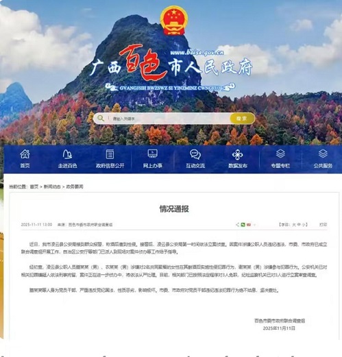 国普网广西讯:据广西百色市人民政府网站信息,近日,我市凌云县公安局接到群众报警,称酒后遭到性侵。接警后,凌云县公安局第一时间依法立案侦查。因案件涉嫌公职人员违纪违法,市委、市政府已成立联合调查组开展工作,自治区公安厅等部门已派人到现场对案件侦办等工作给…